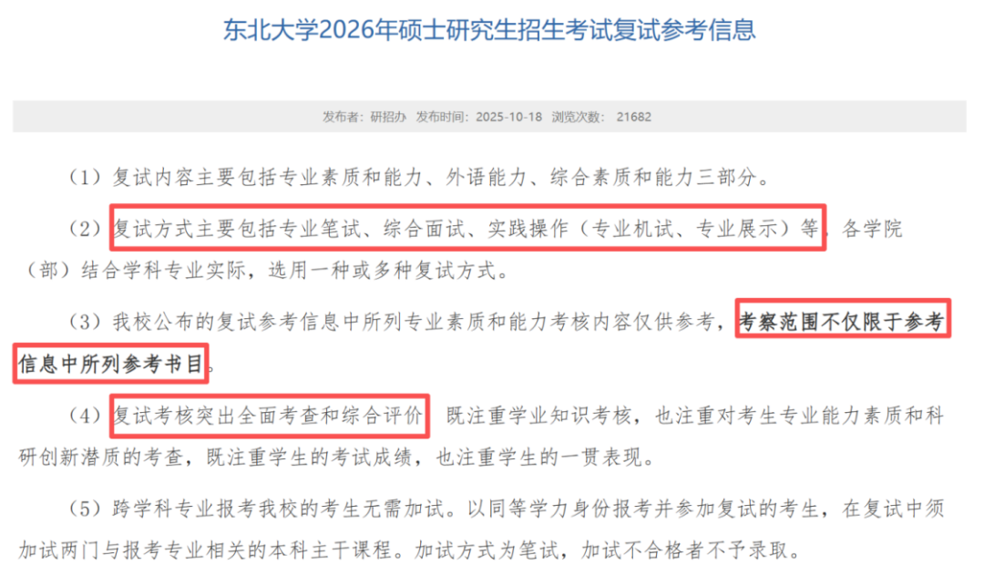 东北大学在2025年考研复试中就已调整部分院系专业,取消专业课笔试改为综合面试,2026年这一政策继续延续,且明确“考察范围不仅限于参考书目”。