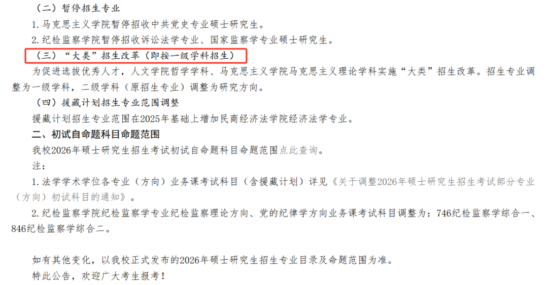 中国政法大学:人文学院原哲学相关二级学科、马克思主义学院原马克思主义理论相关二级学科,均调整为按一级学科招生,原本的二级专业方向不再作为报考选项,而是转为入学后的具体研究方向。