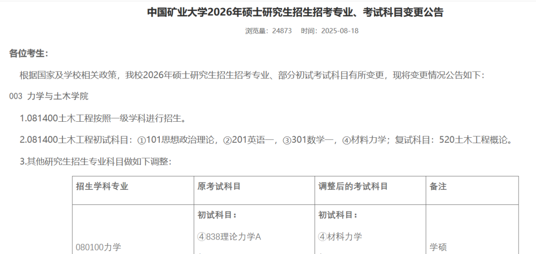 中国矿业大学:热门工科专业【土木工程(081400)】明确调整为按一级学科招生,意味着考生报考时无需细分方向,入学后再结合学习规划与院校资源确定研究领域。