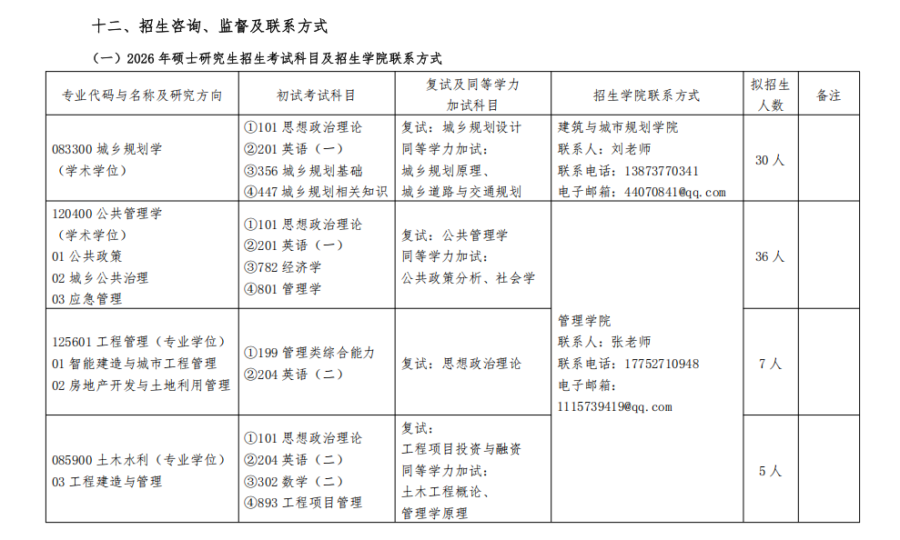 (一)学术学位硕士研究生招生专业:城乡规划学、公共管理学。
