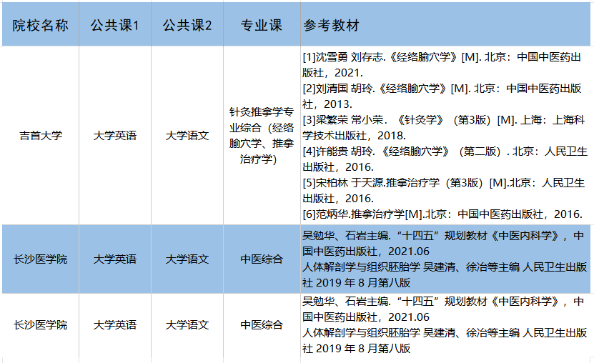 专业课:吉首大学针灸推拿侧重实操理论,长沙医学院中医综合侧重基础(经络、方剂、诊断);