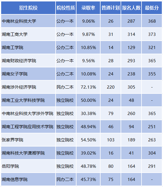 “卷王”院校:湖南工商大学(录取率9.87%)、中南林业科技大学(录取率9.06%),想要冲击这些学校,需要绝对的分数优势。