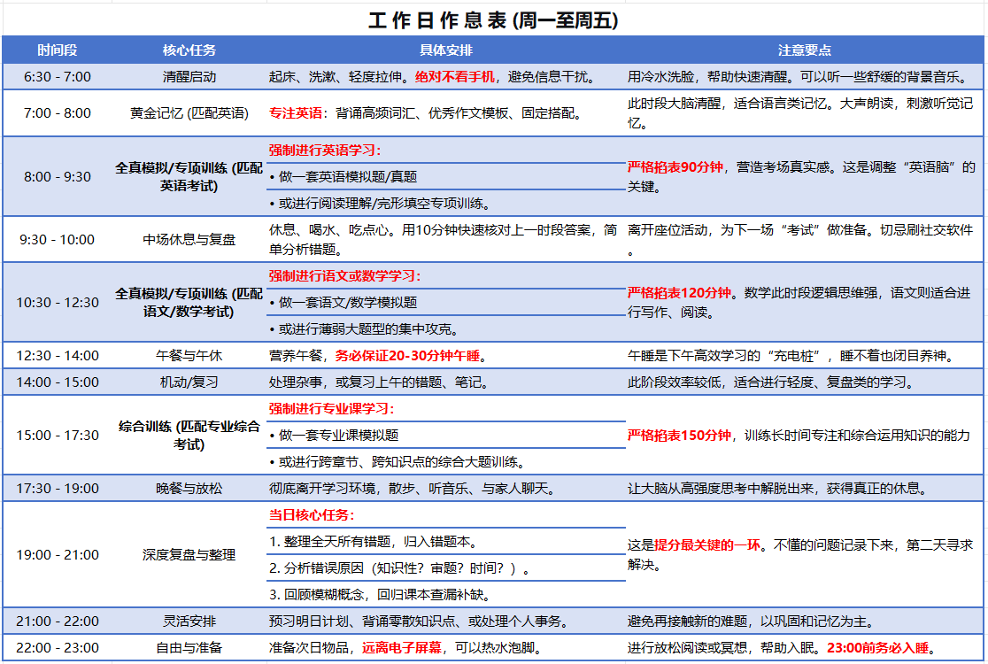 核心目标: 将生物钟与考试时间完美同步,形成“考试肌肉记忆”,在对应时段达到最佳思维状态。