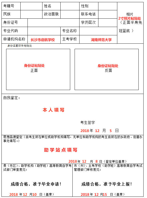 湖南高等教育2018年10月份自考成绩已于11月28日公布,已具备自考毕业条件考生尽快办理毕业证手续。需要提交以下材料: